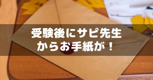 サピックスから1通の封書が来ました。 中学サピックスへの勧誘かな?と無造作に開いてみましたが・・・ サピックス先生から卒業生へのお手紙 でした! 内容は2通で以下の内容。 1通は学年とりまとめの先生から生徒への激励の手紙 1通は通った校舎の先生…