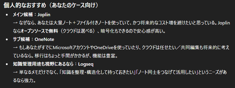 最近だと生成AI様も色々教えてくれるので、早速聞いてみたところ「Joplin」とか「Logseq」とかツール名すら知らないものも出てきました。